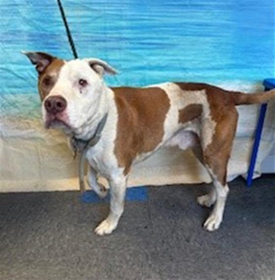 The shelter named me Bo Jo. I am a 9 year old neutered male white & brown Pit Bull Terrier. I have been at the shelter since Friday, August 1, 2025. Must provide proof of home ownership or landlord approval at the time of adoption.