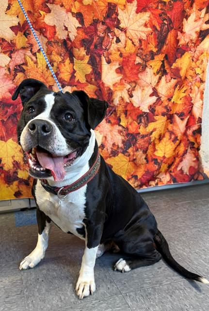 The shelter named me Chub Chub. I am a 7 year old female gray & white Staffordshire Bull Terrier Mix. I have been at the shelter since Friday, August 29, 2025. Must provide proof of home ownership or landlord approval at the time of adoption.